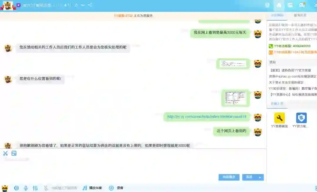 佟女士在得知被骗后,曾经在YY上咨询客服,客服告知其金牌主播如果采用蓝钻结算为佣金方式,结算是无上限的;如果是蓝钻直接提现,那么每日的提现额是3000元。公会的佣金结算和提现则更加高效,每月1-5日在系统结算后,快的话在当月11-12日就可以打款到账上,慢的话则是在当月21-22日,不过快慢是取决于公会的办事效率。