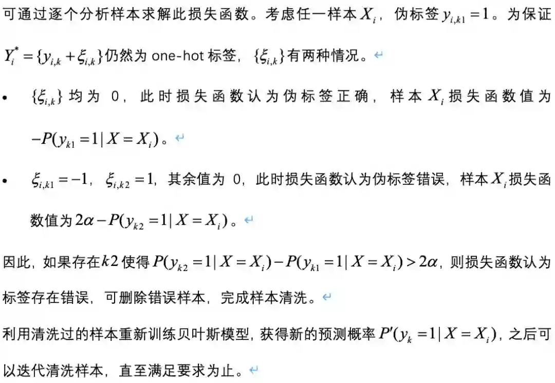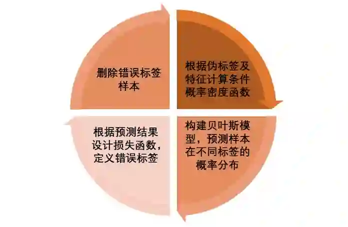 我们基于贝叶斯分类器的分类结果,提出基于伪标签极大似然估计的伪标签损失函数,完成错误样本清洗,再迭代完成贝叶斯分类。该模型的迭代流程如下图所示。