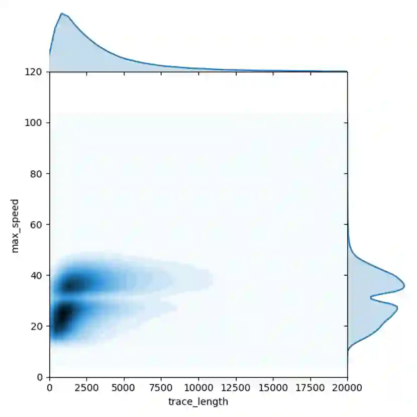 但是,行驶距离与最大速两个维度的特征并不相互独立。上图构建了针对汽车轨迹这两个维度的联合概率密度函数,可以发现,对汽车轨迹而言,行驶距离越长,最大速可能越高,当汽车行驶距离超过10公里时,其最大速度小于50公里每小时的可能性很低。因此,通过构建行驶距离与最大速度两个维度的联合概率密度函数,替换两个独立概率的相乘,可以帮助解决长距离非机动车轨迹被误判为汽车的问题。