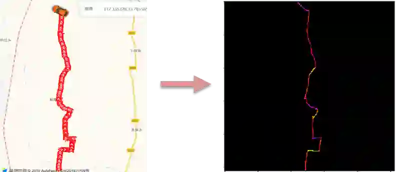 空间分布:将轨迹数据绘制在地图中,则轨迹构成图片中的一条线。如果能够将速度、方向、等待时间编码到线的颜色当中,则能够采用CNN从轨迹图像中学习到有效信息[3]。