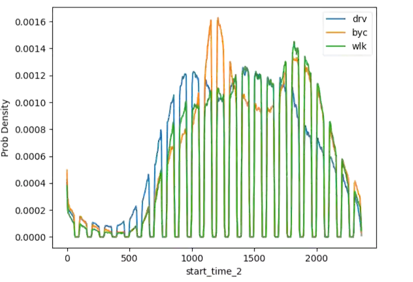 下面以轨迹开始时间特征为例,解释该特征的物理意义。其概率密度函数如下所示(drv,汽车;byc,自行车;wlk,步行):