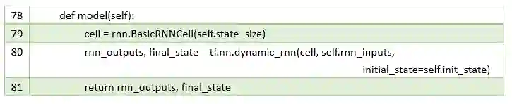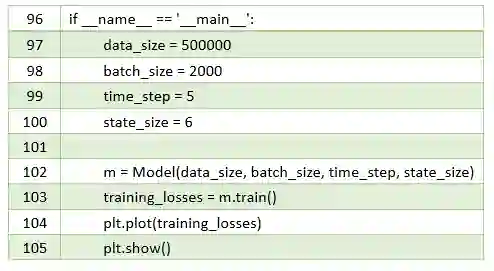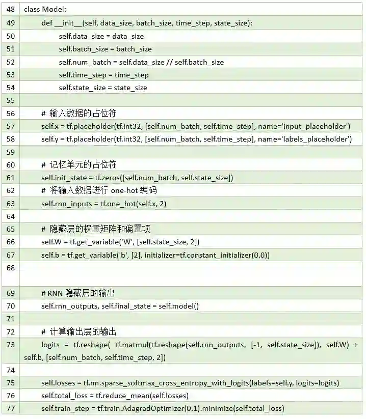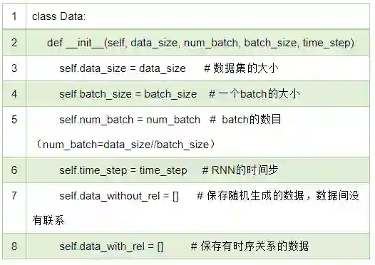 3. 在构造方法“__init__”中,我们初始化了数据集的大小“data_size”、一个batch的大小“batch_size”、一个epoch中的batch数目“num_batch”以及RNN的时间步“time_step”。接下来我们定义一个“generate_data”方法: