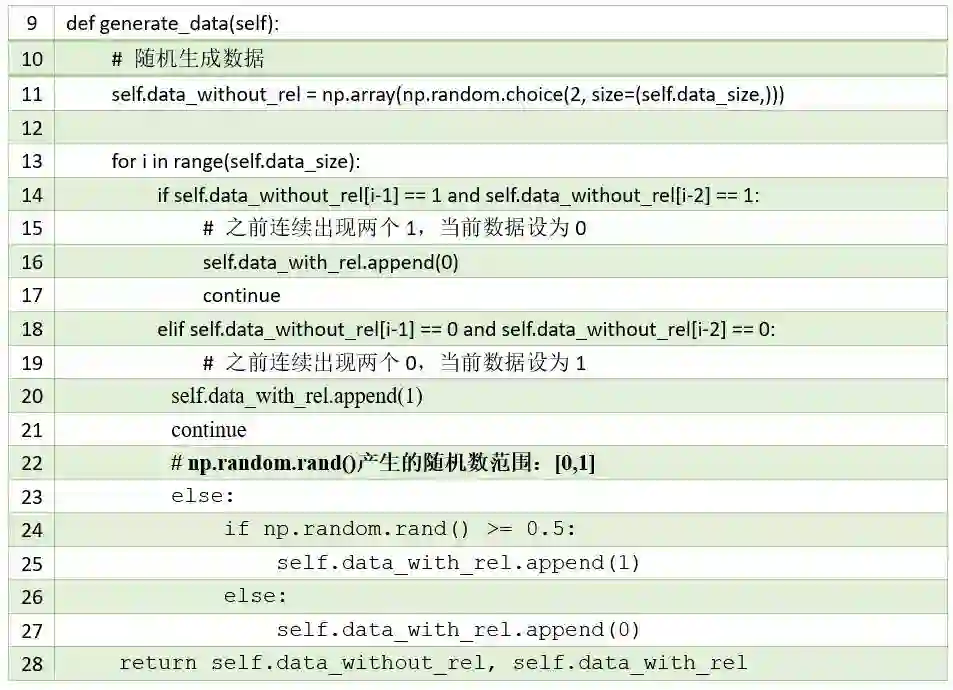 在第11行代码中,我们用了“np.random.choice”函数生成的由0和1组成的长串数据。接下来我们用了一个for循环,在“data_without_rel”保存的数据的基础上重新生成了一组数据,并保存在“data_with_rel”数组中。为了使生成的数据间具有一定的序列关系,我们使用了前面介绍的很简单的数据生成方式:以“data_without_rel”中的数据为参照,如果出现了连续两个1(或0)则生成一个0(或1),其它情况则以相等概率随机生成0或1。