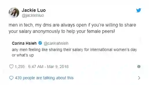 在国际妇女节那天,我在作家Carina Hsieh和#talkpay运动的启发下发表了如下推文,向科技界的男性发出公开邀请,与我分享他们的薪资,我可以匿名发布他们的情况。