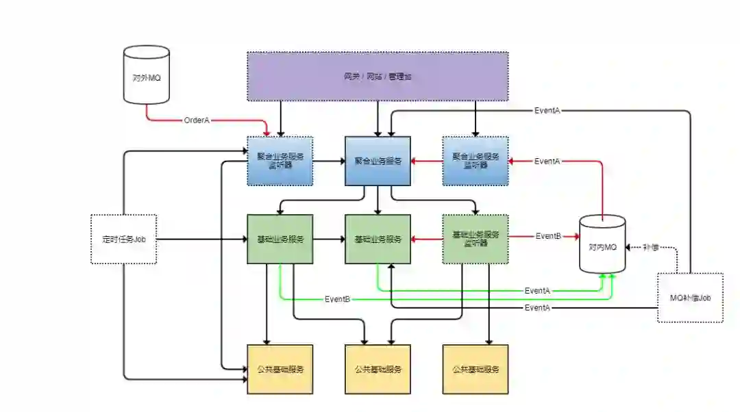 图上画了虚线框的都代表这个模块或项目是不包含太多业务逻辑的,纯粹是一层皮(会调用服务但是不会触碰数据库)。黑色线的箭头代表依赖关系,绿色和红色箭头分别是MQ的发送和订阅消息流的方向。具体在后文都会进一步详细说明。
