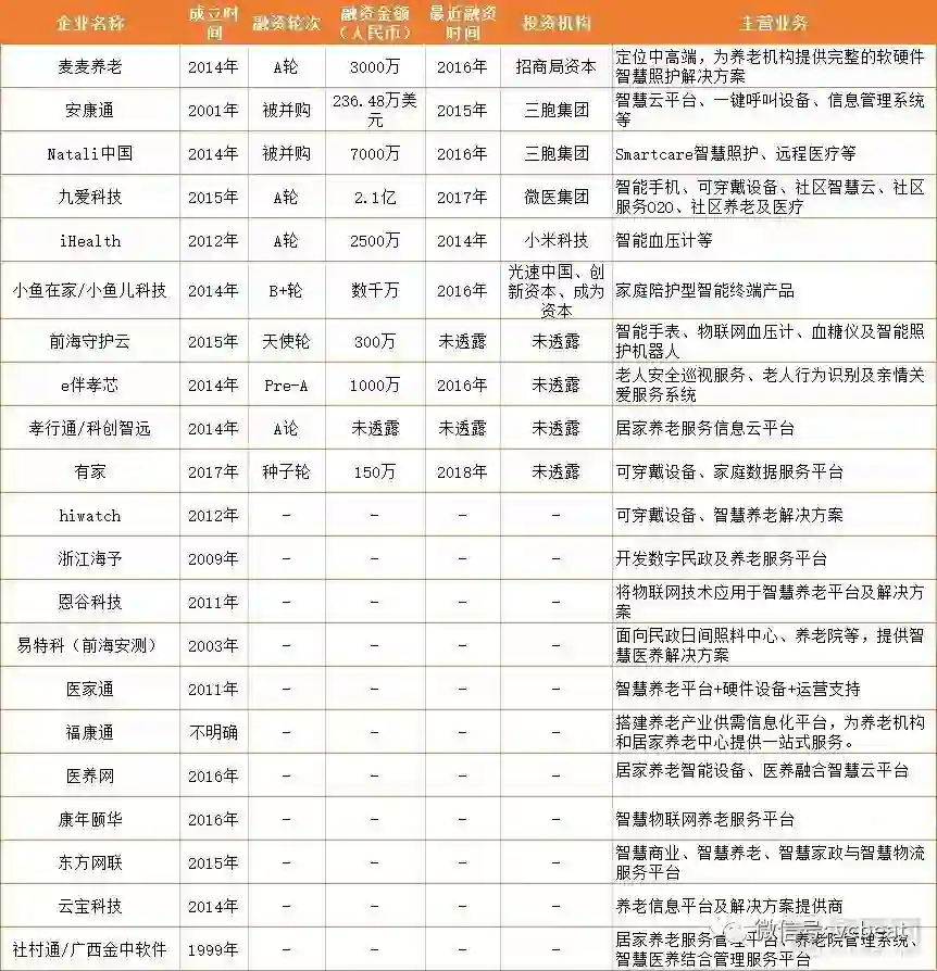 3月,智能居家养老系统安心桥完成500万元的融资,投资方为云创世纪;9月,居家养老共享平台养你一辈子完成2000万元的融资,投资方为马蚁投资;迪安诊断与阿里健康建立长期战略合作关系,共同探索“智慧养老运作模式”,智慧养老项目如雨后春笋般涌现。