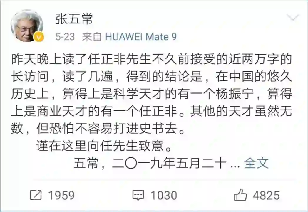 著名华人经济学家张五常评论说:在中国悠久历史上,称得上科学天才的是杨振宁,称得上商业天才的是任正非。其他天才虽然无数,但恐怕不容易打进史书去。