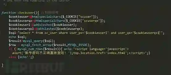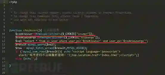 第二处注入在登陆时,这里对传递的cookie值过滤有漏洞,这个文件在funtion.php里面。首先看一下代码,这里只是直接对两个获取到的值进行了html实体转义。然后就直接拼接了。
