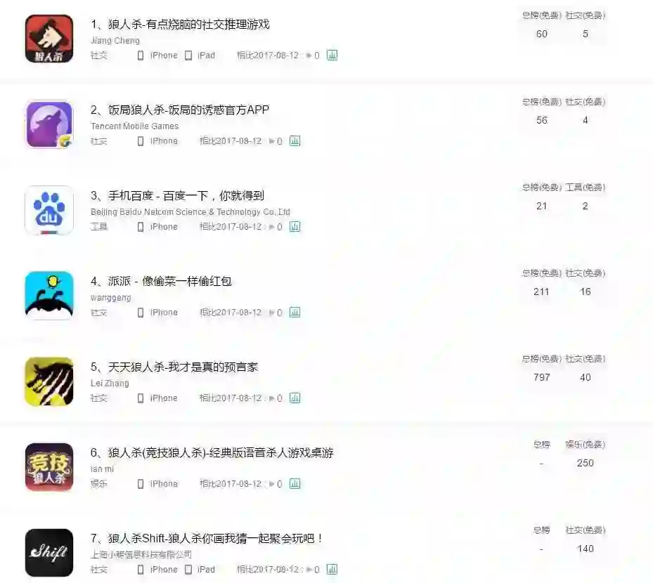 APP中排名进入总榜1000的有5款,分别是狼人杀-有点烧脑(免费总榜20)、狼人杀-天天狼人杀(免费总榜125)、玩吧(免费总榜209)、手狼(免费总榜636)狼人杀online(免费总榜748),另有一款付费总榜230的狼人杀2017。