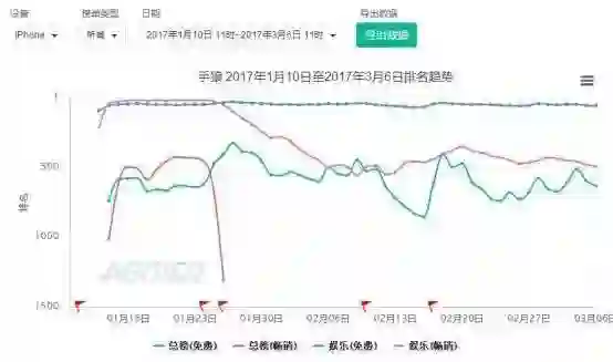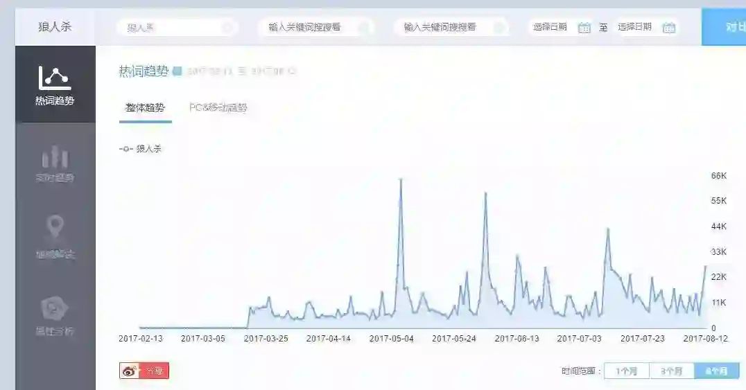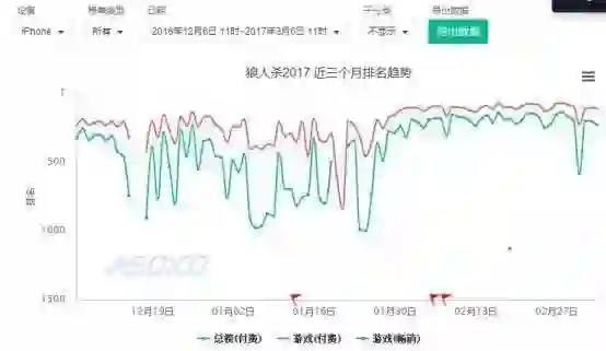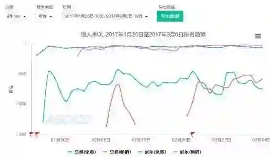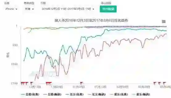 17年1月初开始出现高速增长,狼人杀百度指数由1.6W到2月中旬的5.8W,再到3月4日已到7W+,并且仍处于持续增长中。