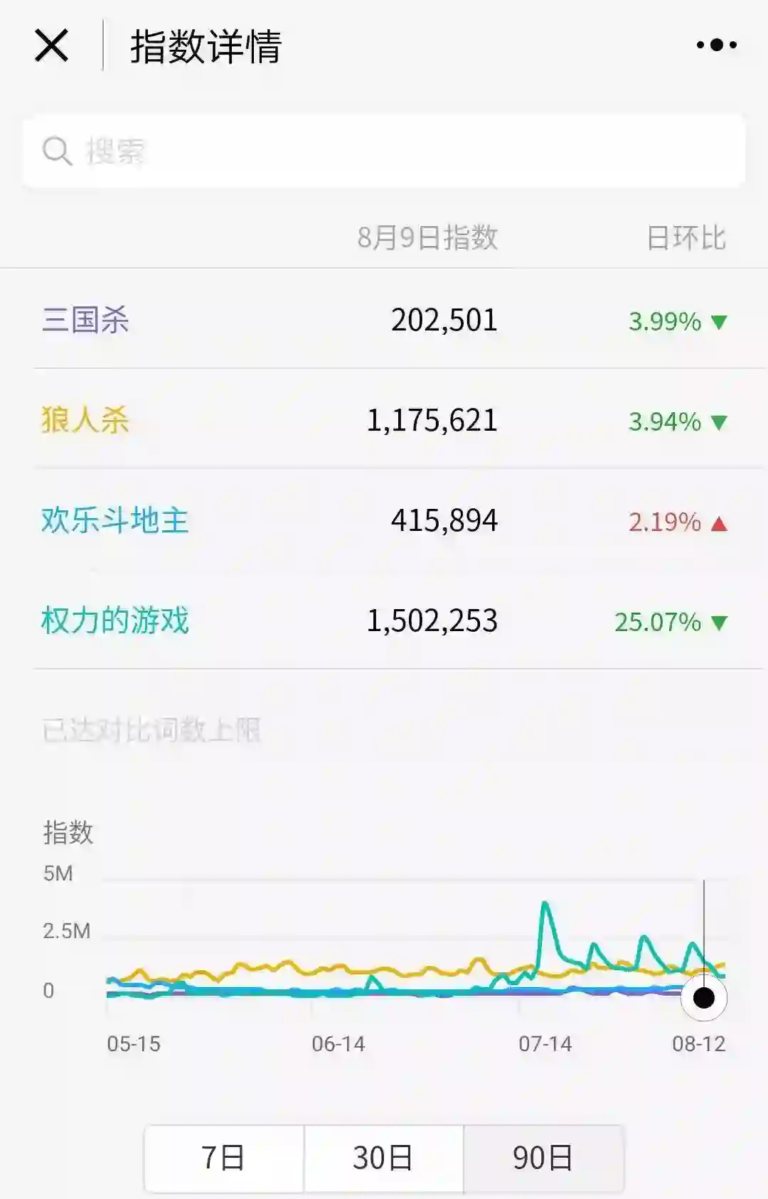 三国杀与狼人杀整体指数目前还处于同一水平,两者PC端变化不大,但移动端三国杀不到狼人杀的20%。