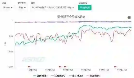 App《玩吧》(不是单纯的狼人杀游戏,还有很多其他小游戏如你画我猜等)目前IOS免费总榜209,社交免费第19,于13年3月9日上线,经历9个大版本,其近3月榜单变化如下: