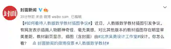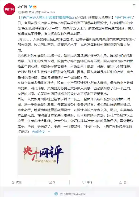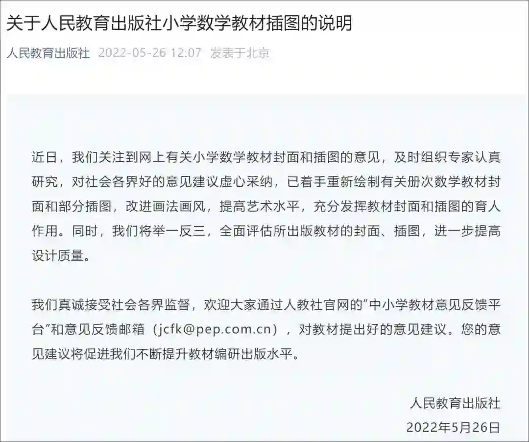5月26日,人民教育出版社微博回应称,已着手重新绘制有关册次数学教材封面和部分插图,改进画法画风,提高艺术水平,充分发挥教材封面和插图的育人作用。