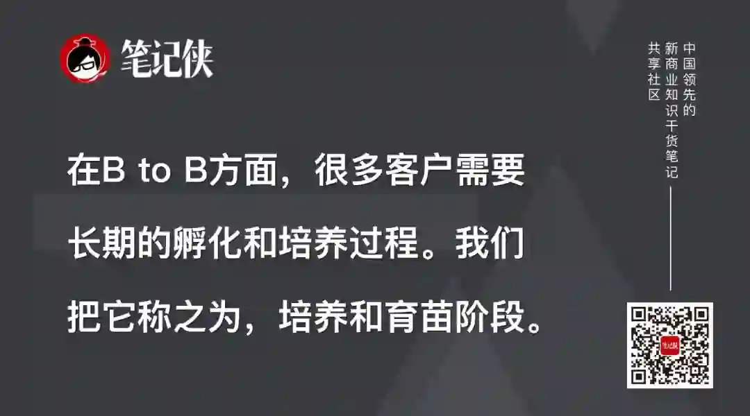 在B to B方面,我们发现,很多客户不是一上来就有购买倾向,需要长期的孵化和培养过程。我们把它称之为,培养和育苗阶段。