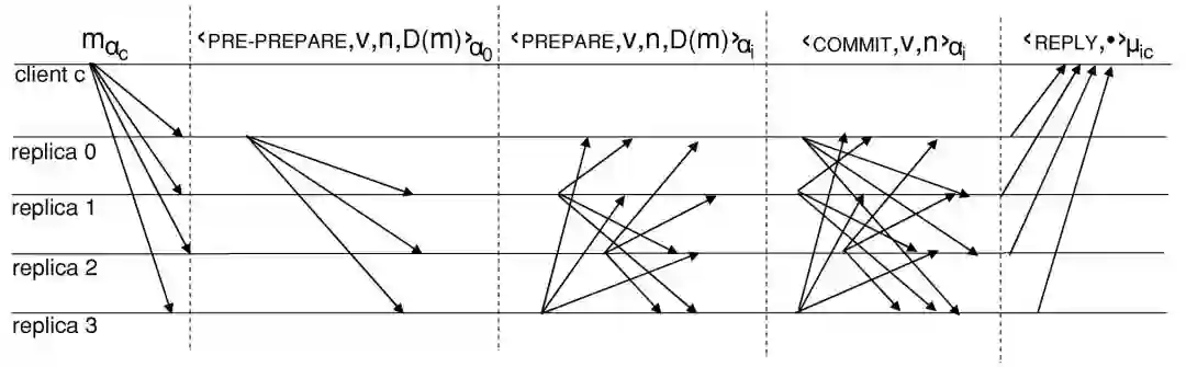 如图所示,从客户端发起请求到收到回复结果,可以分为5个阶段,而共识过程采用了3阶段协议。下面简要叙述5个阶段的大致过程: