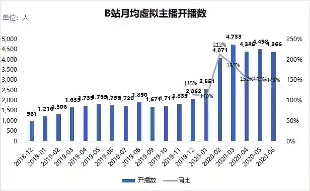 小葫芦的监测数据显示,2020年初至今,B站上每个月约有4000多个虚拟主播开播,过去半年的月均增速都在100%以上。