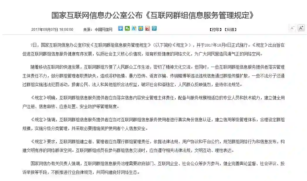 【TechWeb报道】国家互联网信息办公室昨日公布《互联网群组信息服务管理规定》(简称《规定》),并于2017年10月8日正式施行。