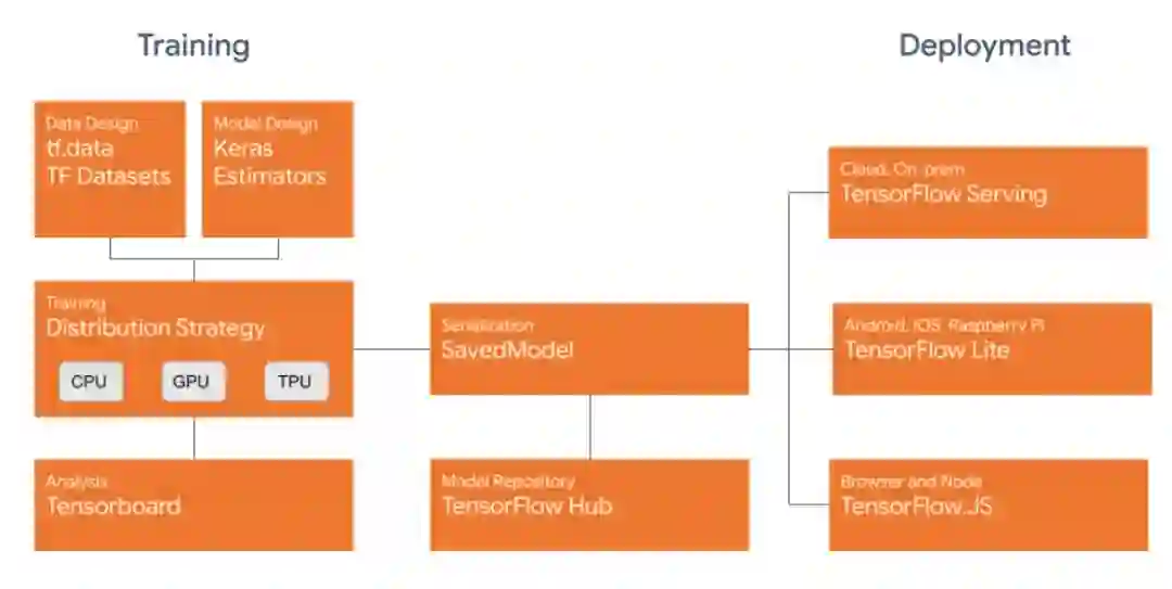 能够在各种runtimes(包括云、web、浏览器和Node.js,移动和嵌入式系统)上运行模型,我们对SavedModel文件格式进行了标准化。这允许用户使用TensorFlow运行模型,使用TensorFlow服务部署模型,使用TensorFlow Lite在移动和嵌入式系统上使用模型,使用TensorFlow.js在浏览器或Node.js上训练和运行模型。