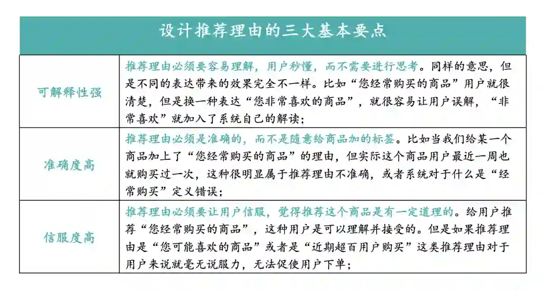 如上图所示推荐理由需要具备三大基本要点:可解释性强、准确度高和信服度高,三者缺一不可;