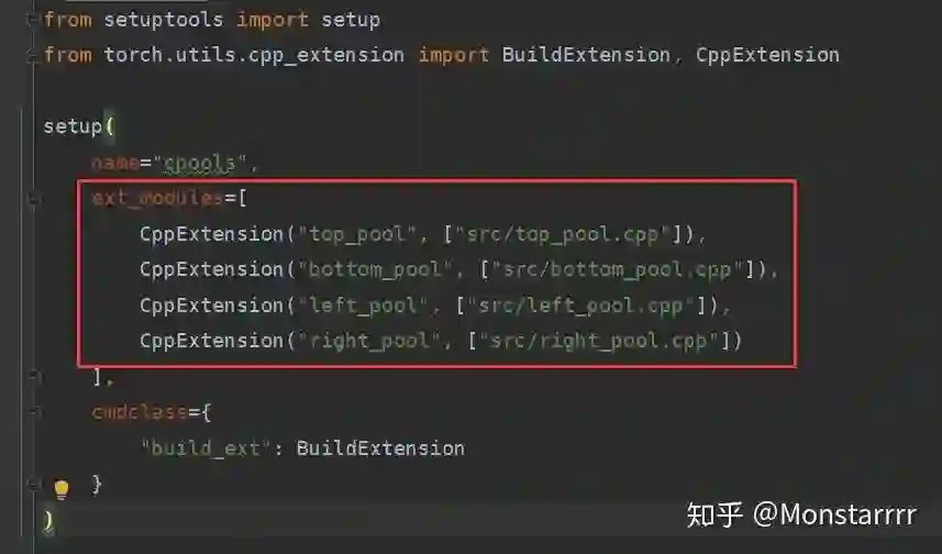 这一部分基本上算是一个固定的格式针对不同的问题需要修改的地方就是ext_modules参数,这里面根据实际的需要列表中可以存在多个CppExtension模块,也就是说可以同时编译多个C++文件。