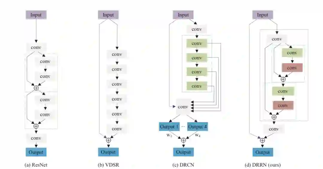 每一个卷积层都对应一个非卷积层。简单来讲,可以理解为是将一张图片进行了编码,然后紧接着进行解码。它的优势在于解决了梯度消失的问题,而且能恢复出更干净的图片。它和 VDSR 有相似的思路。中间卷积层与反卷积层的训练是针对原始图片与目标图片的残差。最后原图会与训练输出结果相加,得到高分辨率的图片。
