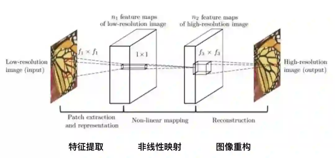超分辨率神经网络(Super-Resolution CNN,SRCNN)是深度学习应用在超分辨率领域的首个模型。原理比较简单。它有三层神经网络,包括: