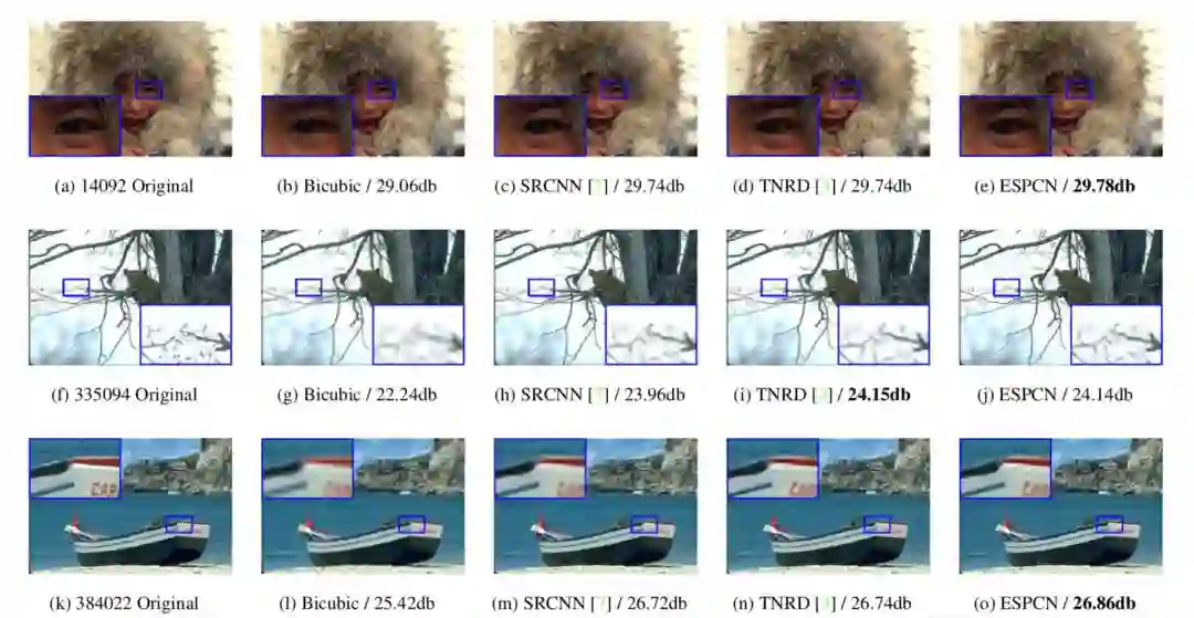 对实时视频进行超分辨率处理的实验结果也非常理想。对 1080 HD 格式的视频进行3倍放大,SRCNN 每帧需要0.435s,而 ESPCN 则只需0.038s。