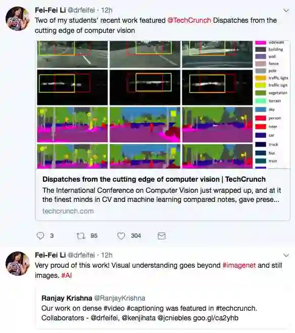 大意为:我的学生最近的论文被TechCrunch网站选为“计算机视觉最前沿的十篇论文”之一,我真是为它们感到骄傲。继Imagenet后,计算机视觉仍然在不断突破我们的想象力。