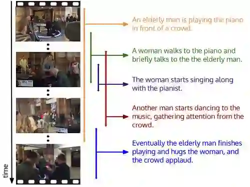 该论文还发现:视频中的各事件之间往往存在联系。在图1中,观众鼓掌的原因是因为演奏者表演了钢琴弹奏。因此。模型必须能够利用从前后事件中得出的上下文信息,来捕捉每个时间。最近发表的一份论文试图通过多个语句来描述视频中的事件;但是论文中使用的是“烹饪”教学视频,视频中的事件和物体之间存在很高的关联性,而且事件有一定的发生顺序。