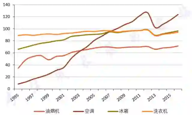 2016年,我国农村每百户吸油烟机保有量仅为 18 台,远低于冰箱每百户保有量90台。