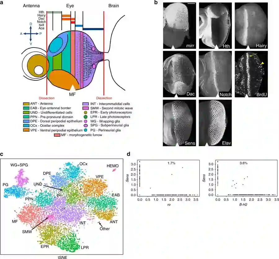 研究者首先利用 Drop-seq 在第三龄幼虫眼盘构建细胞目录,在其视柄和视触角区解剖,分离成单细胞悬浮液,在 11 个生物复制过程中解剖 550 个眼盘并执行 scRNA-seq,在质量控制后,从 11416 个单个细胞中收集测序数据,共检测到 16331 个基因,随后使用 Seurat8 进行了 tSNE 分析确定了 15 个不同的细胞群,使得样品间没有明显的批量效应。