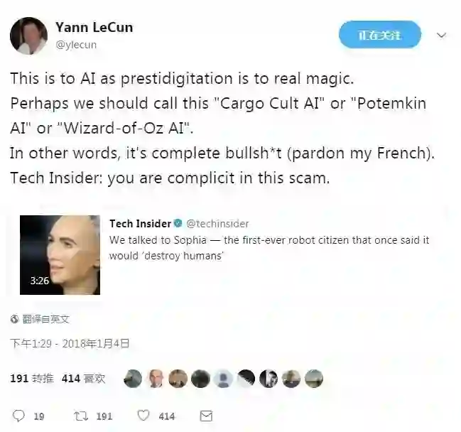 近日,Sophia 再次来到外媒 Tech Insider 录制了一期采访以后,深度学习大佬 Yann LeCun 终于忍不了了,在 Twitter 上公开指责 Sophia 是彻头彻尾的骗局。