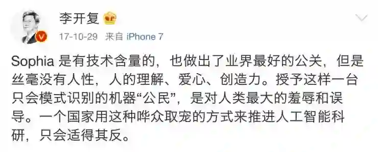 李开复也曾在微博上发帖评论 Sophia,称授予其公民是对人类的羞辱、是推进人工智能科研的反作用。
