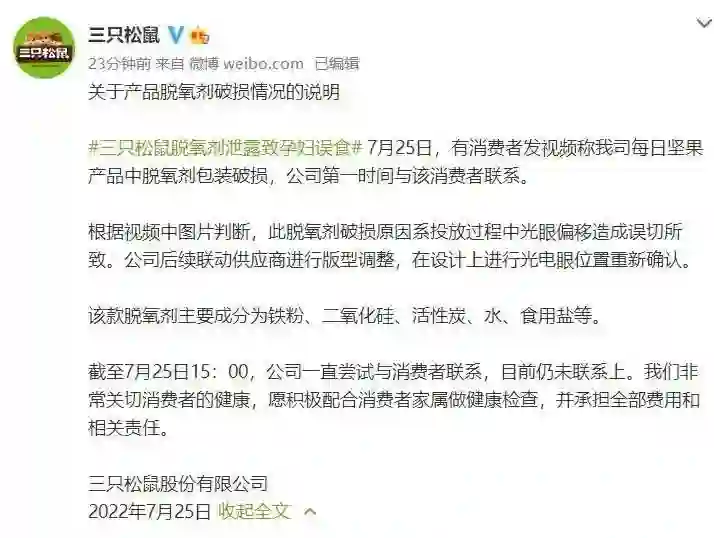 三只松鼠回应孕妇误食脱氧剂:投放过程中光眼偏移造成误切所致