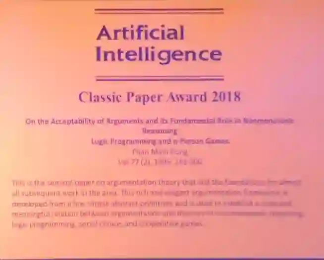 经典论文奖:On the Acceptability of Arguments and its Fundamental Role in Nonmonotonic reasoning Logic Programing and n-Person Games