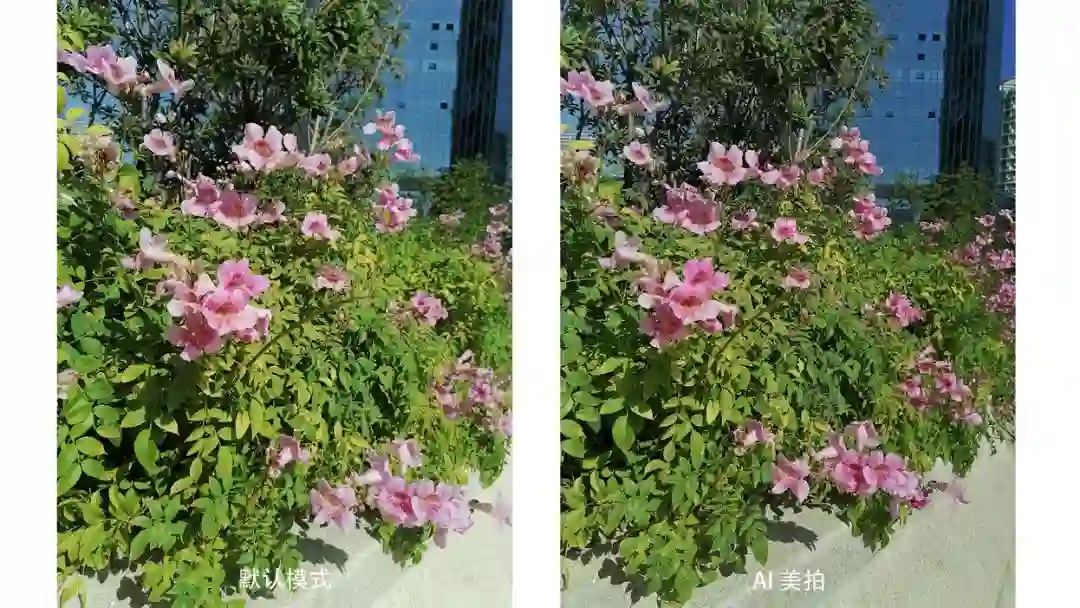 正常模式里的很多黄色被 AI 智能还原为绿色,花朵的红色被 AI 还原成鲜艳的红色。整个图片看起来更加自然。