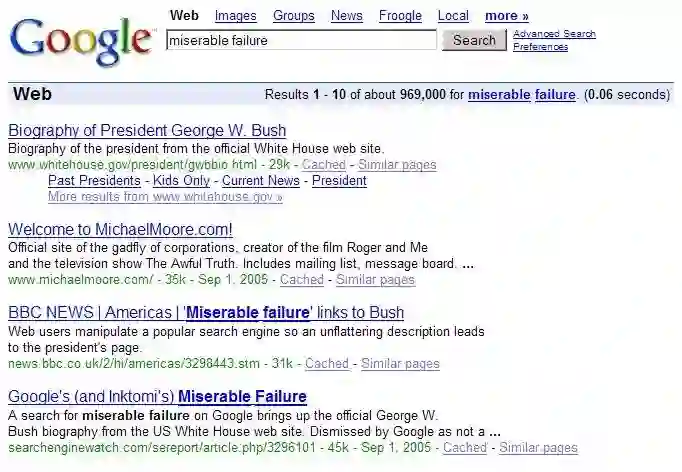 2004年,在美国总统大选期间,小布什再次受到谷歌炸弹的攻击,网友们将“Miserable failure”(悲惨失败)与小布什的白宫主页的搜索结果相连。