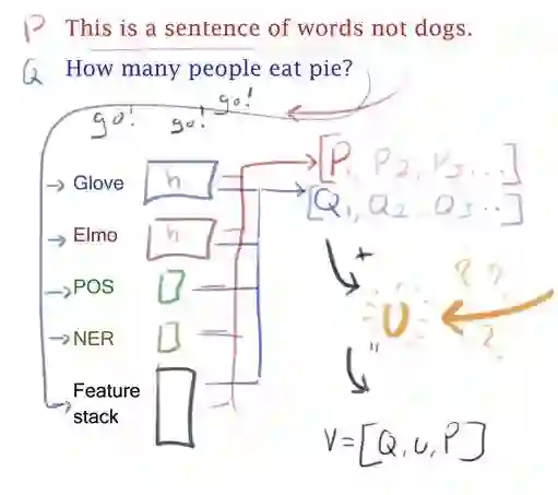 在这里,这些模型会得到所有这些巨大的嵌入的堆栈,它们将为文章中的每一个单词计算一次这样的嵌入,再为问题中的单词也计算一次。它们最后会通过另一个随机向量u的简单连接将这些嵌入结合在一起。从而得到:V=[Q,u,P]