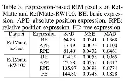 RefMatte 由 230 个对象类别、47,500 个图像、118,749 个表达式区域实体和 474,996 个表达式组成,将来可以很容易地进一步扩展。除此之外,作者还构建了一个真实世界测试集,该测试集由 100 幅自然图像组成,使用人工生成的短语标注来进一步评估 RIM 模型的泛化能力。首先定义了基于提示和基于表达两种背景下的 RIM 任务,然后测试了几种典型的图像抠图方法以及具体的模型设计。这些结果为现有方法的局限性以及可能的解决方案提供了经验性的见解。相信新任务 RIM 和新数据集 RefMatte 将在该领域开辟新的研究方向,并促进未来的研究。