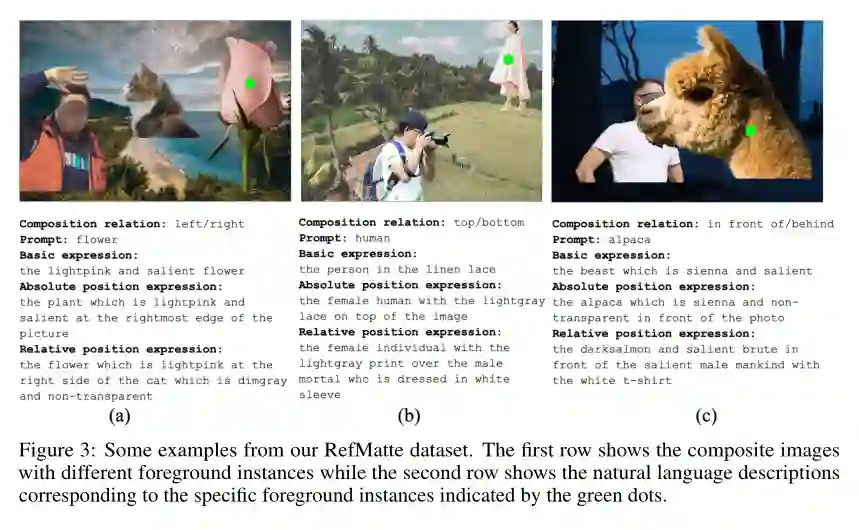 语言驱动的任务,例如 referring expression segmentation(RES)、referring image segmentation(RIS)、视觉问答(VQA)和 referring expression comprehension(REC)已被广泛探索。基于 ReferIt、Google RefExp、RefCOCO、VGPhraseCut 和 Cops-Ref 等许多数据集,这些领域已经取得了很大进展。例如,RES 方法旨在分割由自然语言描述指示的任意对象。然而,获得的 mask 仅限于没有精细细节的分割级别,由于数据集中的低分辨率图像和粗略的 mask 标注。因此,它们不可能用于需要对前景对象进行细致 Alpha 抠图的场景。
