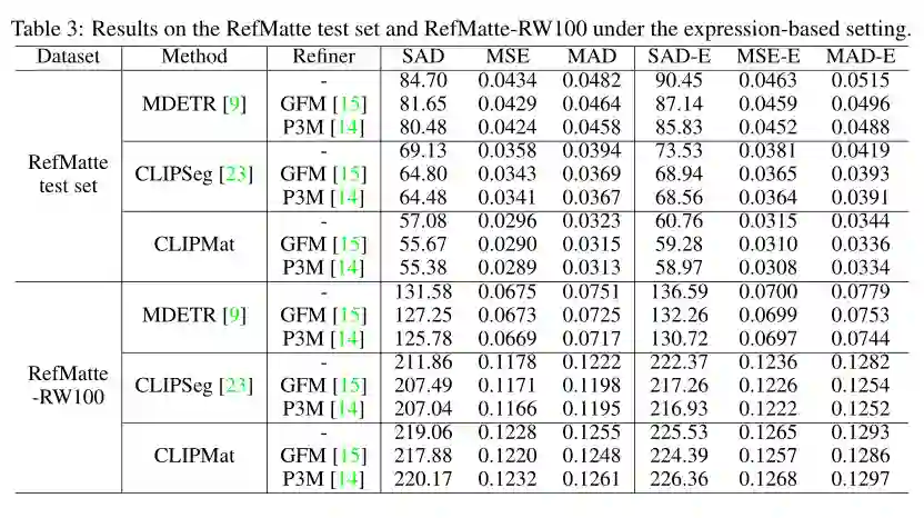 作者还在 RefMatte 测试集和 RefMatte-RW100 的基于表达式的设置下评估了这三种方法,并在上表中显示了定量结果。CLIPMat 再次在 RefMatte 测试集上表现出良好的保留更多细节的能力。在 RefMatte-RW100 上进行测试时,像 CLIPSeg 和 CLIPMat 这样的单阶段方法落后于两阶段方法,即 MDETR,这可能是由于 MDETR 的检测器在理解跨模态语义方面的能力更好。
