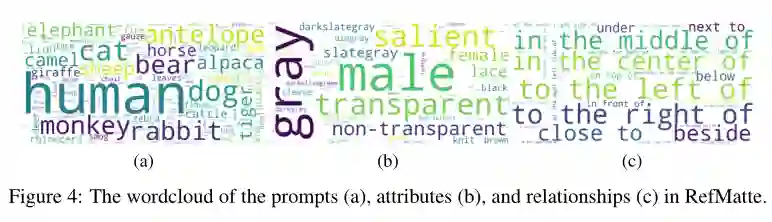 作者还在上图中生成了 RefMatte 中的提示、属性和关系的词云。可以看出,数据集有很大一部分人类和动物,因为它们在图像抠图任务中非常常见。RefMatte 中最常见的属性是男性、灰色、透明和显着,而关系词则更加平衡。