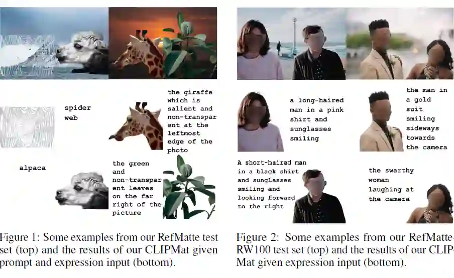 为了解决这个问题,作者提出了两种为 RIM 定制它们的策略,即 1)在 CLIPSeg 之上精心设计了一个名为 CLIPmat 的轻量级抠图头,以生成高质量的 alpha 抠图结果,同时保持其端到端可训练的管道;2)提供了几种单独的基于粗图的抠图方法作为后期精炼器,以进一步改善分割/抠图结果。广泛的实验结果 1)展示了所提出的 RefMatte 数据集对于 RIM 任务研究的价值,2)确定语言描述形式的重要作用;3)验证提议的定制策略的有效性。