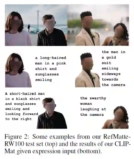 具体来说,为了构建这个数据集,作者首先重新访问了许多流行的公共抠图数据集,如 AM-2k、P3M-10k、AIM-500、SIM,并手动标记仔细检查每个对象。作者还采用了多种基于深度学习的预训练模型为每个实体生成各种属性,例如人类的性别、年龄和衣服类型。然后,作者设计了一个综合的构图和表达生成引擎,以生成具有合理绝对和相对位置的合成图像,并考虑其他前景对象。最后,作者提出了几种表达逻辑形式,利用丰富的视觉属性生成不同的语言描述。此外,作者提出了一个真实世界的测试集 RefMatte-RW100,其中包含 100 张包含不同对象和人类注释表达的图像,用于评估 RIM 方法的泛化能力。上图显示了一些示例。