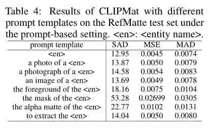 为了调查提示输入形式的影响,作者评估了不同提示模板的性能。除了 使用的传统模板外,作者还添加了更多专门为图像抠图任务设计的模板,例如 the foreground/mask/alpha matte of <entity name>。结果如上表所示。可以看到 CLIPmat 在不同提示下的性能差异很大。