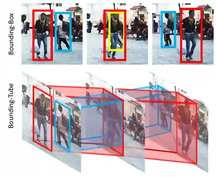 图 8:Bounding-Tube 示意图。使用 bounding-tube 可以轻松跟踪到 bounding-box 无法检测到的被遮挡目标(图中黄色框)。