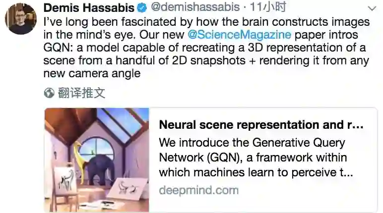 想想是不是有点激动,DeepMind创始人哈比萨斯也一样,今天他也难得发推特,介绍了这一成果:我一直着迷于大脑如何在大脑的眼睛中构建图像。我们新推出的Science论文介绍了GQN:一种新模型,能够从一些2D快照中重新创建各角度3D场景。