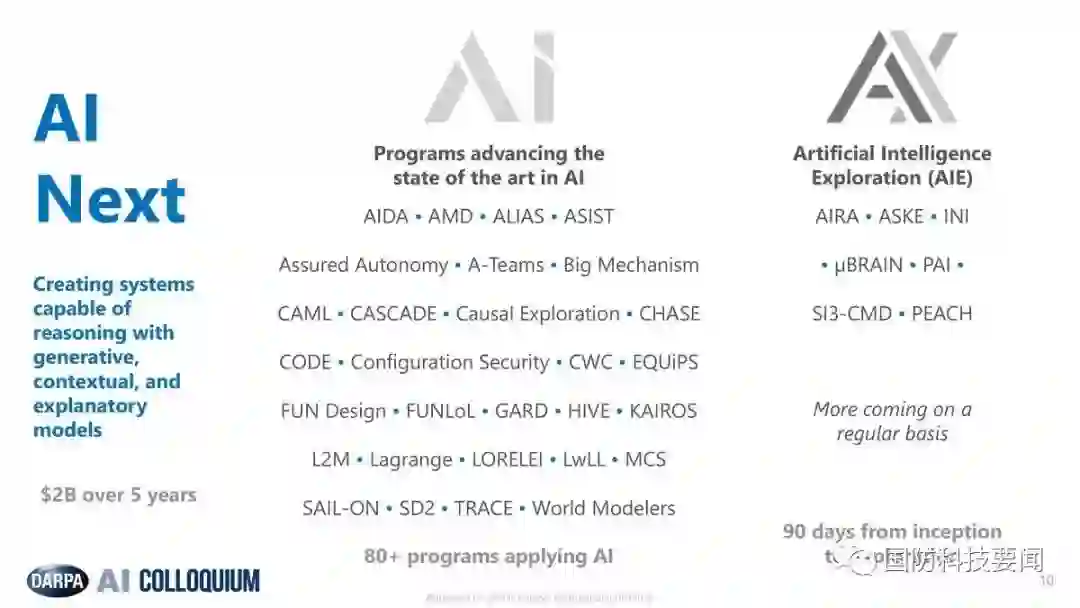 除了新的和正在进行的研究,DARPA于2018年7月宣布启动“人工智能探索”(AIE)项目,作为“下一代人工智能计划”的一个关键组成部分。该项目由一系列高风险、高回报的子项目组成;研究人员需在获得合同后18个月内,使新的人工智能概念具备可行性;这些子项目利用简化的合同程序和筹资机制,可在机会宣布后3个月内就从提案发展到项目工作启动。