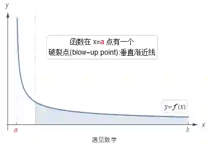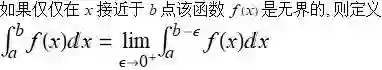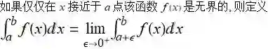 中 f 不是有界的: 当 x 在区间 [a,b] 内, 函数 f 在区间有一条垂直渐近线的时候, 函数会在渐近线附近变得很大, 且没有界限, 这就使该积分成了反常积分(improper).
