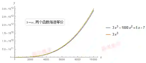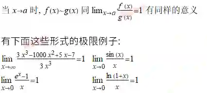 实际上, 可以对渐近等价函数做相乘, 相除, 幂运算或变量替换都是适用的. 但加减关系并不适用!